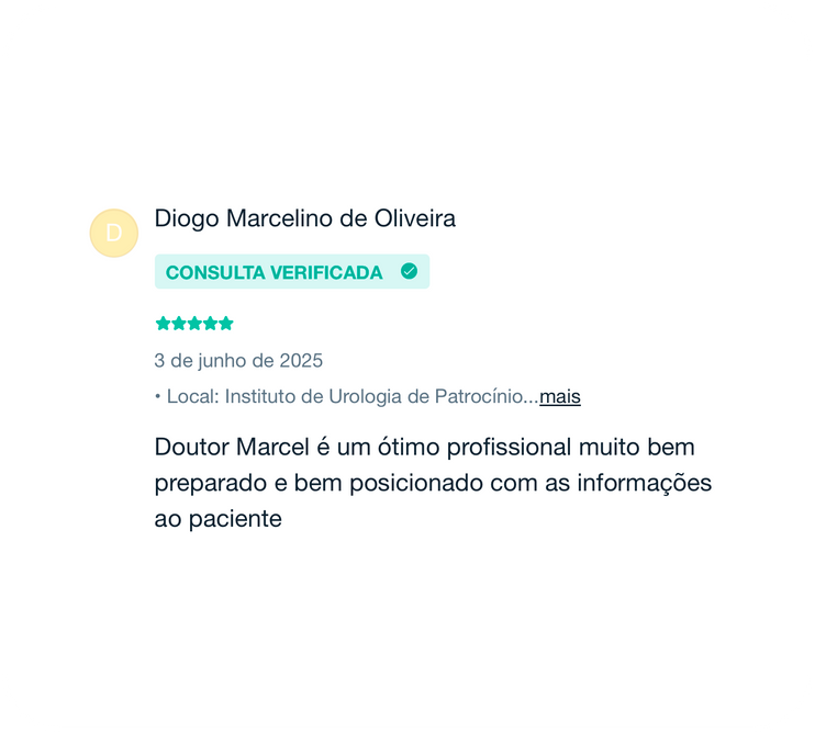 Sou médico urologista, com formação em Cirurgia Geral e Urologia, e membro titular da Sociedade Brasileira de Urologia. Atuo com foco no cuidado ético, humano e baseado em evidências, atendendo homens, mulheres e crianças.